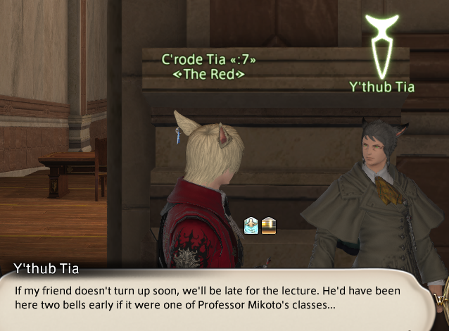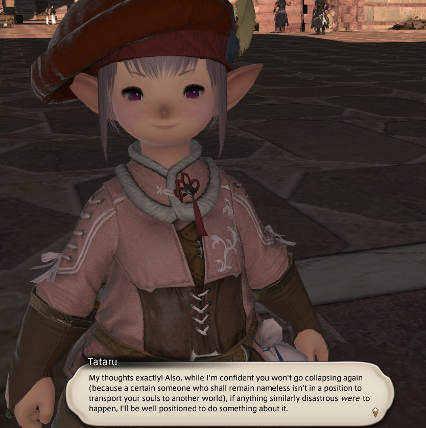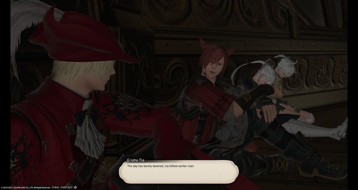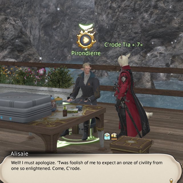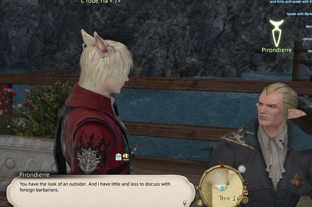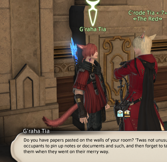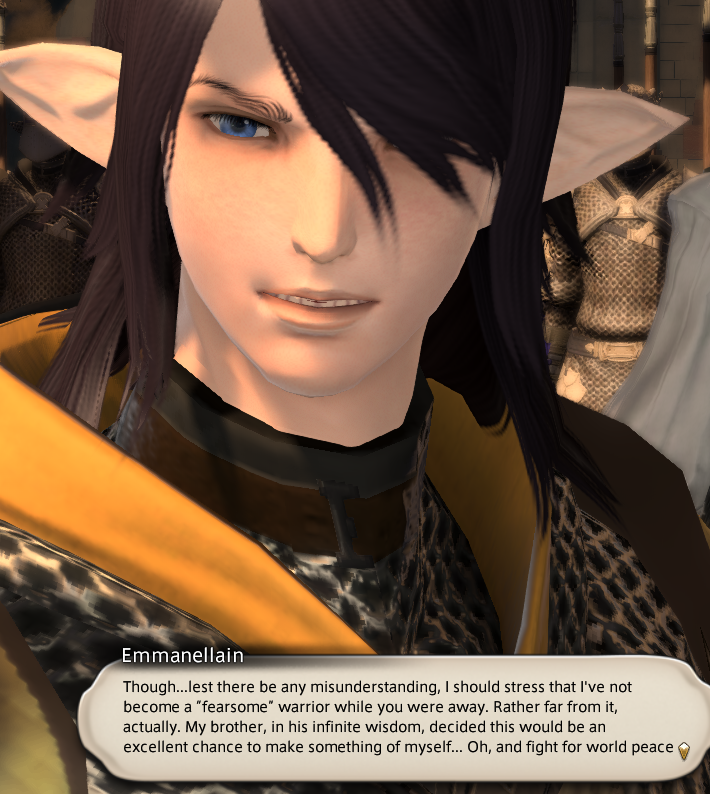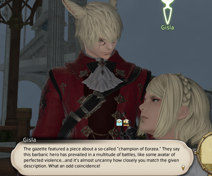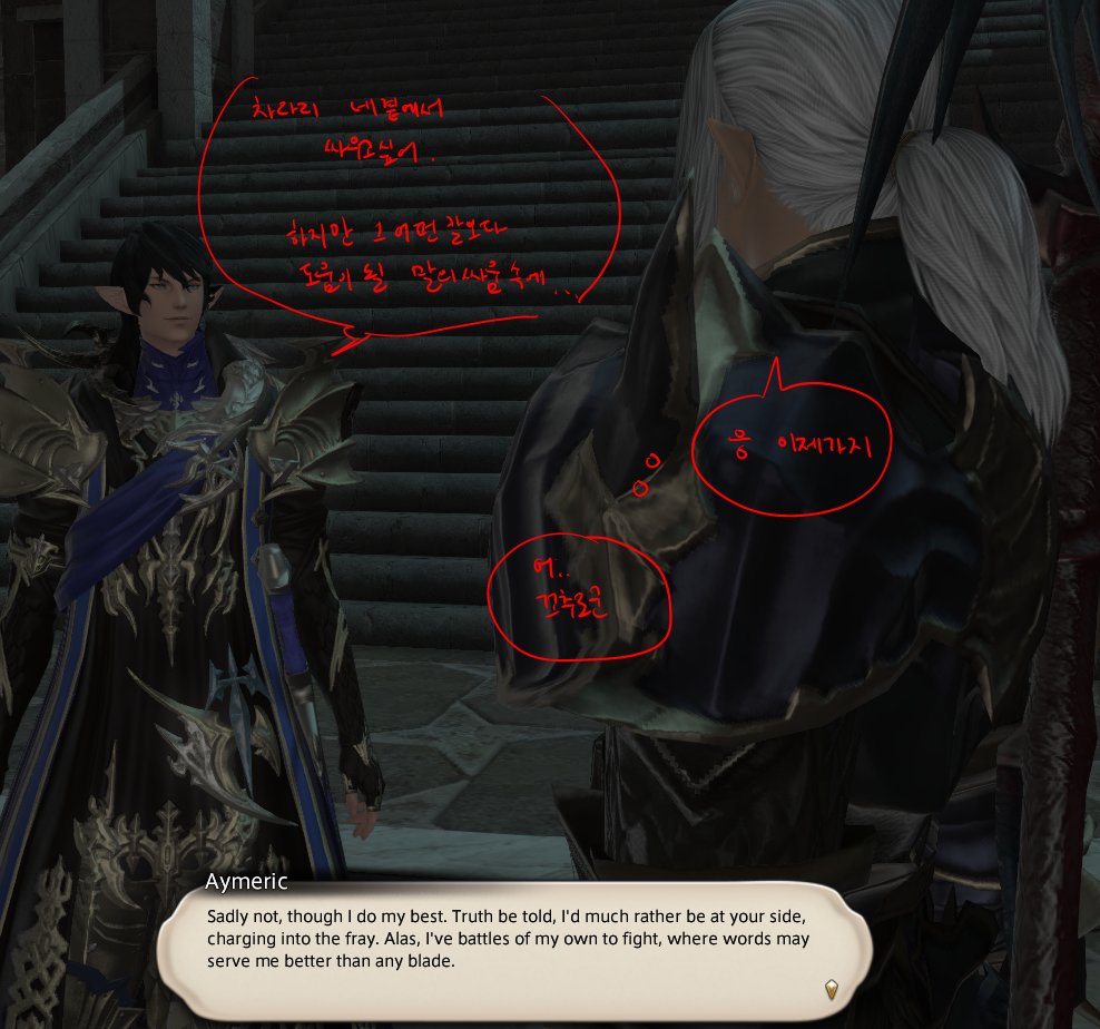 산크레드와 위리앙제에게 꼭 갈레말드의 날씨에 대해 물어봐야 겠어... 추운건 알겠지만 뭐 얼마나 추운거지? 귀를 막고 있어야 하나...? 그게 가끔 예민하기도 해서... 아이메리크: 여기서 만나다니! 정말 반갑군. 내 친우가 새벽에 잘 정착하고 있다고 믿어도 되는거겠지? 협동은 그의 특기였던 적이 없어. 전투가 끝난 순간 매번 강풍에 휩쓸린 게일리캣처럼 사라지곤 했으니까. 하지만 안심해도 된다네. 네가 필요로 할 때 항상 곁에 있을테니까. 아마도...