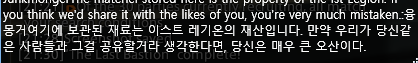 신문에 "에오르제아의 영웅" 이라는 짧은 기사가 특집으로 실렸더군요. 이 야만적인 영웅은 수많은 전투에서 승리했다고 전해져요. 마치 완벽한 폭력의 구체화 된 상 처럼 말이죠. 당신이 그 인상착의와 제법 닮아서 묘한걸요... 정말 이상한 우연이군요! 나 샬레이안에선 바바릭 이라는 단어 를 쓸만큼 야만인인거인 ㅋㅋㅋㅋ
