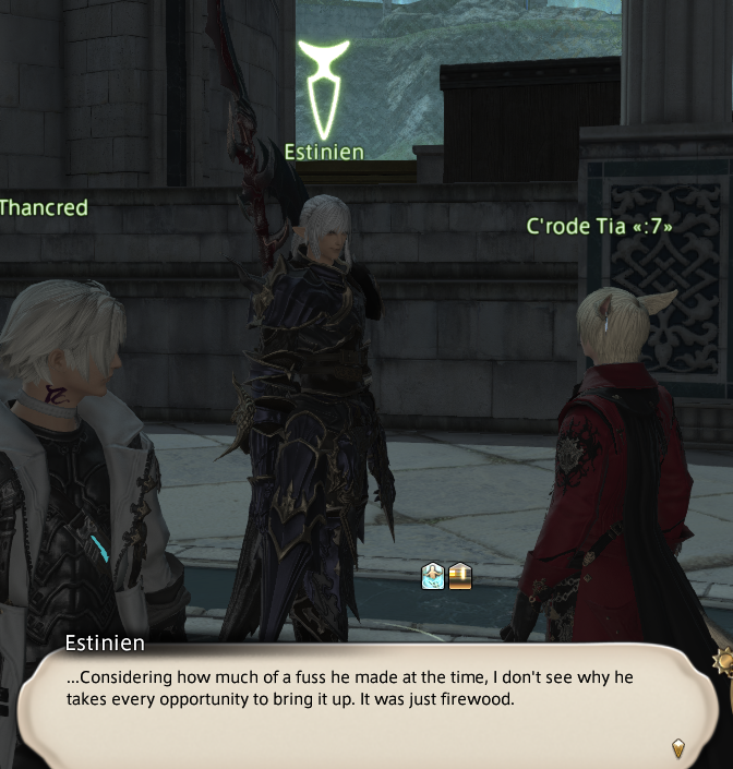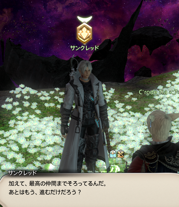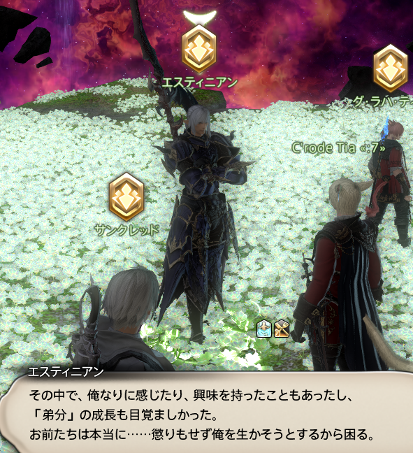 덕택에 이렇게 돌아온 것이지만……너와의 약속을 이루려면, 우선 종말을 멈추고 무사히 돌아가지 않으면 안 되니까.이슈가르드나, 당신의 소중한 곳을 안내받는 것……아직 보지 못한 새로운 모험을 떠나는 것…기대하고, 싸워낼게. 이번 이상의 모험이 있냐고? 앞으로 얼마든지!네가 원해 내딛는 한!