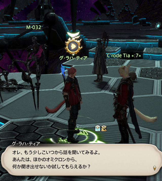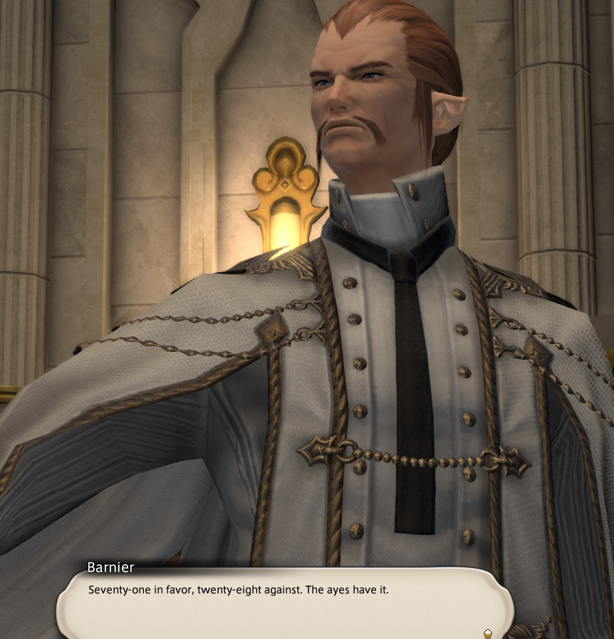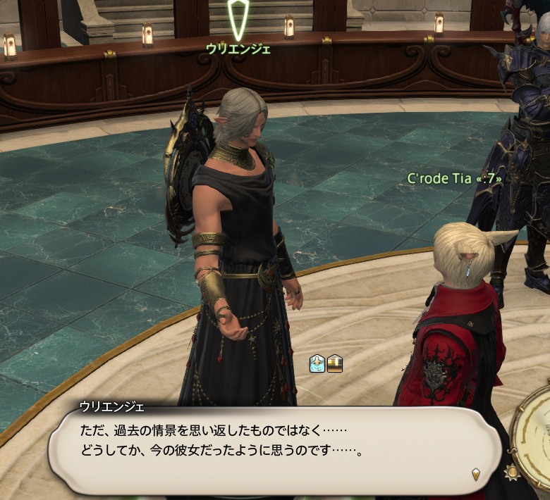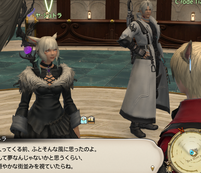 빅스씨들도 말했습니다만, 우리는 지금까지, 많은 일을 경험해 왔습니다. 「모래의 집」이 습격당한 것이나, 나나모님 암살의 혐의로 「돌의 집」조차도 쫓긴 것……그렇게 해서 「눈의 집」에 굴러 들어간 것…….이슈가르드에서는 결투재판에 회부되었지요.동방에서도 활동하게 되고, 도우러 분주 하고 있으면, 여러분이…… 쓰러졌다고 보고가 들어와….제1세계에 가 있던 여러분의 영혼이, 몸으로 돌아온 그날의 일……잊을 수 없습니다.나에게 있어서는, 여러분을, 일희일비 하면서 계속 지켜본 날들이었습니다.고생이나, 비명을 질렀던 경험도, 수없이 있었지만……많은 사람과 사물을 만날 수 있어서, 매우 즐거웠습니다. 그러니까 이번에도 가슴을 펴고 여러분을 배웅하겠습니다.그리고, 돌아왔을 때에는…… 또, 제일 먼저 「어서와요」라는 말을 하고 싶습니다!