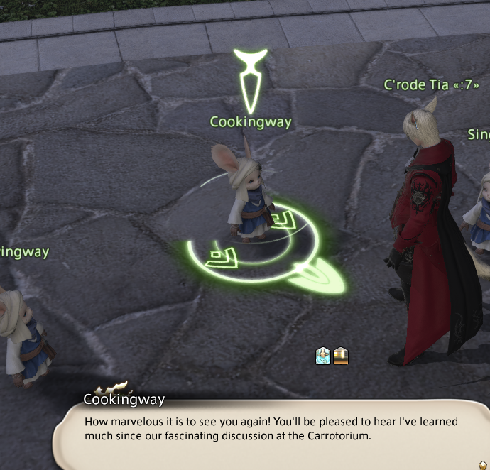 쿠킹웨이: 당신을 다시 만나다니 정말 놀랍군요~! 캬롯토리움에서의 흥미로운 토론 이후로 많은 걸 배웠다면 기뻐하시겠죠? 위리앙제 덕분에 요리의 좋은 점을 많이 배웠습니다! 제 이름에도 불구하고 그간 너무 정보가 부족했어요. 음식도 엄청 많고 발음도 어려워요!
