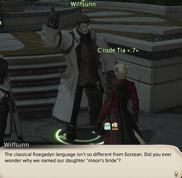 루가딘 어는 에오르제아 어와 크게 다르지 않단다. 왜 우리가 딸 이름을 달의 신부라고 지었는지 궁금했던 적 있니? 내가 처음 그 아이를 안아봤을 떄 달은 은 빛으로 밝게 빛나고 있었고, 온 세상이 빛나는 것 같았어. 나는 그 아이가 선택받았다는 걸 알았지.