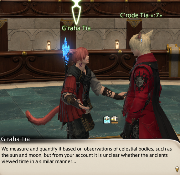 에스티니앙: 만약 미드가르드오름이 아직 살아있었다면, 분명 전통적인 수단으로 선박이 속도를 내도록 도울 수도 있었을텐데. 뭐 그렇다 하더라도 충분할지는 모르겠지만.. (초코보아니거든ㅋ ㅋ )위리앙제: 최근 레포리트의 흔적을 본 적이 없습니다... 샬레이안의 경이로움을 경험할 수 있는 첫 기회이니... 뭘 하고 있을지, 경우의 수는 거의 무한합니다...산크레드: 대체 누가 그들의 빛나는 계획이 거대한 배를 만들어 달로 날아가고, 사실 더 큰 배인 달로 다른 별까지 여행하기 위해 사용할거라고 생각했을까. 솔직히 지금도 육성으로 말해보면 완전 터무니 없어 보여.